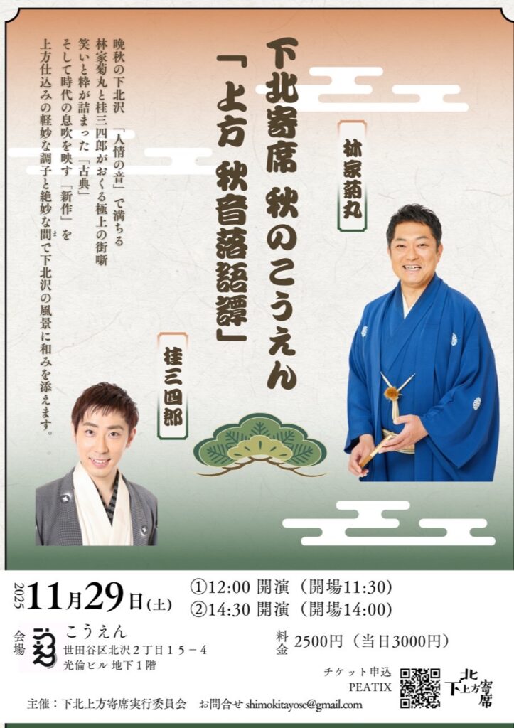 《東京》 下北寄席 秋のこうえん 「下北秋音落語譚」 下北沢で林家菊丸兄さんの落語会にゲスト出演いたします。 12時〜 14時〜 2回公演です。 出 演 林家菊丸 2席 桂三四郎 1席 お問い合わせ チラシを参照 または 桂三四郎公式ライン https://lin.ee/NqWqrZ6 Tweet 末廣亭11月下席 スケジュール一覧 末廣亭11月下席