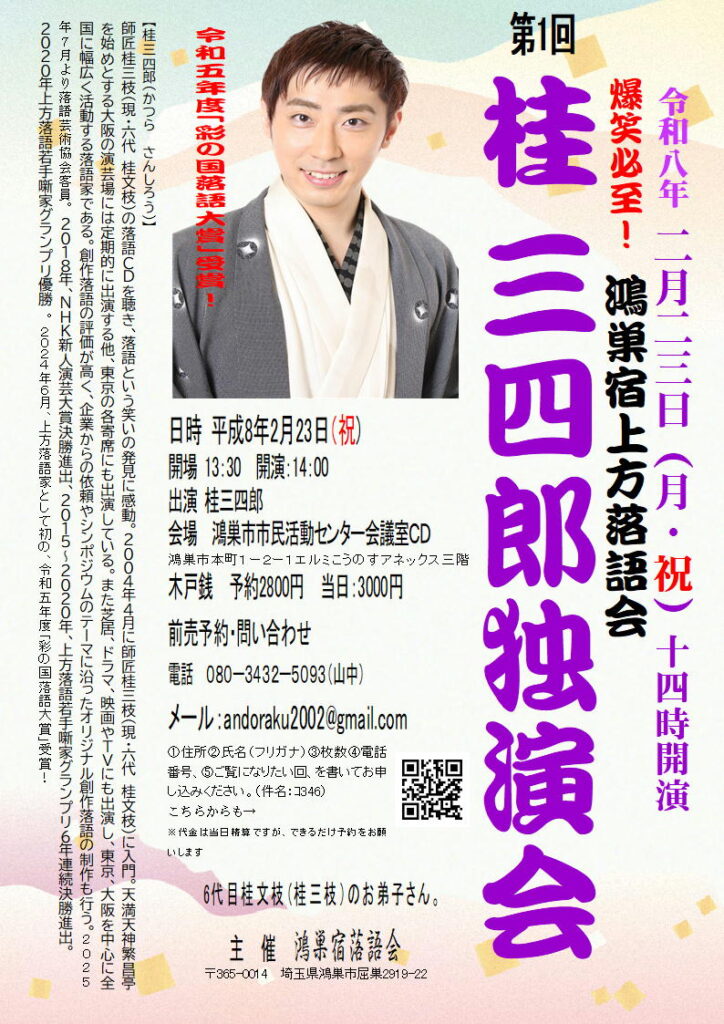 《東京》 桂三四郎独演会〜鴻巣宿上方落語会 第一回の鴻巣での独演会です。 おすすめ公演です^_^ 日 時 2026年02月23日 (月) 開演:14時(開場:13時30分) 会 場 鴻巣市市民活動センター会議室CD 料 金 予約:2,800円(当日:3,000円) 出 演 桂三四郎 三席 お問い合わせ チラシを参照 または桂三四郎公式LINEにて https://lin.ee/Vd7zNem Tweet 桂三四郎ひとり会in喜楽館 スケジュール一覧 桂三四郎 柳亭小痴楽二人会